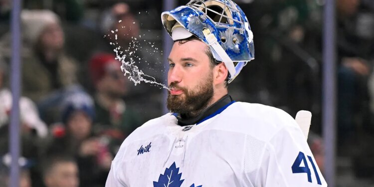 Toronto Maple Leafs goaltender Anthony Stolarz spits out his water during the second period of a NHL game between the Minnesota Wild and Toronto Maple Leafs on March 15, 2026, at Grand Casino Arena in Saint Paul, MN. (Nick Wosika/Icon Sportswire)