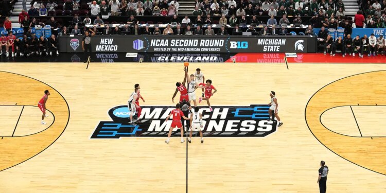 General view of the second round of the NCAA Men’s Basketball Tournament tipoff between New Mexico Lobos and Michigan State Spartans at Rocket Mortgage Fieldhouse on March 23, 2025, in Cleveland, Ohio. (Jason Mowry/Getty Images)