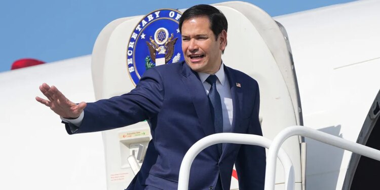 US Secretary of State Marco Rubio boards a plane en route to El Salvador at Panama Pacifico International Airport in Panama City on Feb. 3, 2025. Rubio is in Panama on a two-day official visit. (Mark Schiefelbein/Pool/AFP via Getty Images)