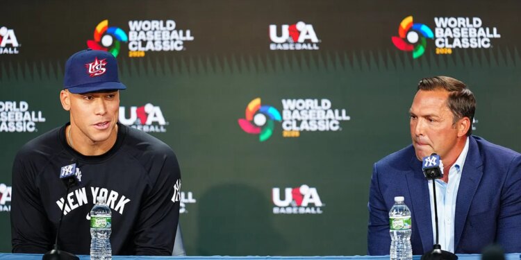 WBC Team USA Captain Aaron Judge of the New York Yankees and Team USA manager Mark DeRosa speak to the media during a game between the Kansas City Royals and the New York Yankees at Yankee Stadium April 14, 2025, in New York, N.Y. (Mary DeCicco/MLB Photos)