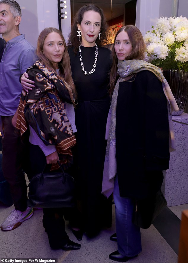 Mary-Kate (left) and Ashley Olsen (right) attended a party thrown Thursday by W Magazine and Bloomingdale’s, and posed with the magazine’s editor-in-chief Sara Moonves (center)