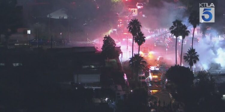 The gas company was requested due to a gas leak at one of the homes involved, as well as crews with the L.A. Department of Water and Power to manage downed power lines along the rear of the initial three homes that erupted in flames.