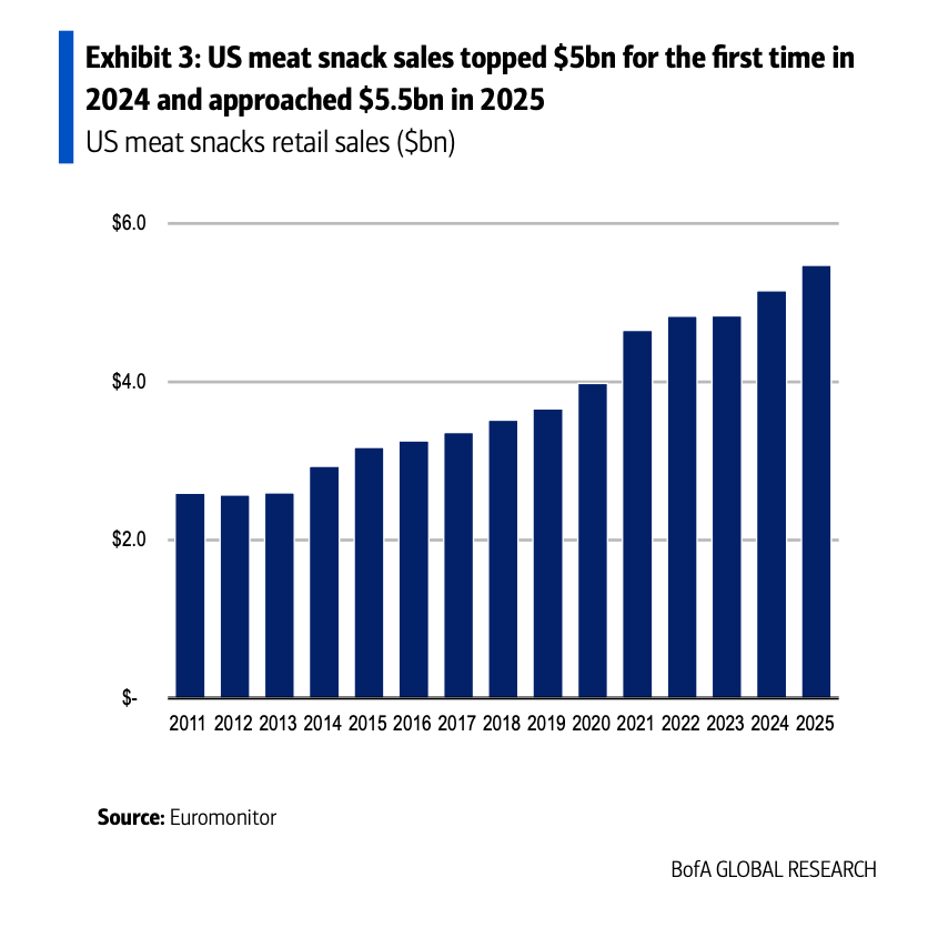 BofA calculated that meat snacks represent $5.5 billion, or 7% of the “savory snack” category, which came to $74.9 billion in 2025. This category includes products such as salty snacks (potato and tortilla chips, puffed/rice/veggie snacks), savory biscuits (crackers), popcorn, pretzels, and meat snacks.