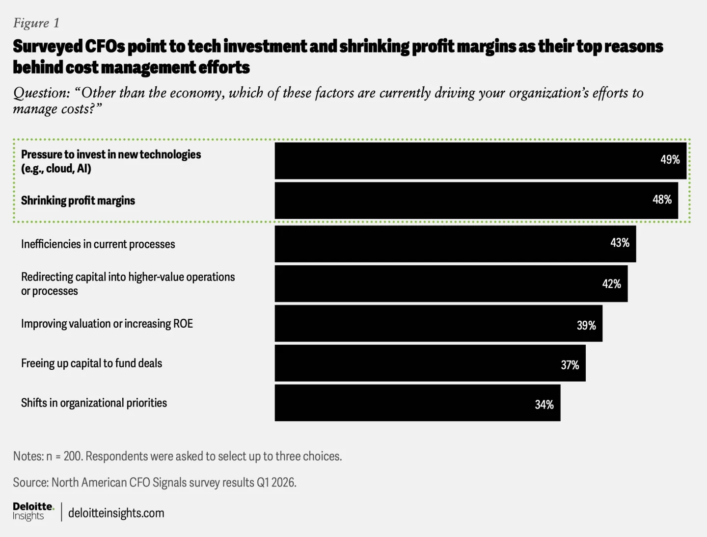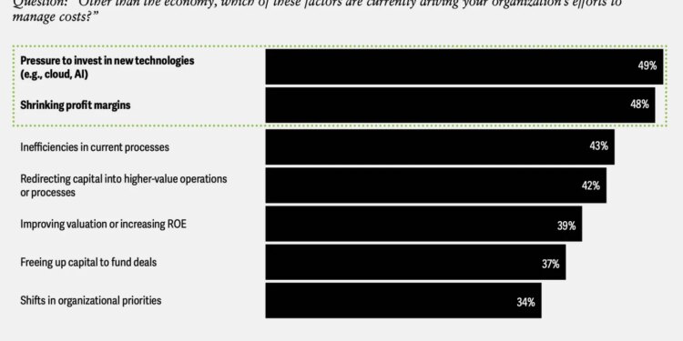 When asked to select up to three factors driving their organization’s efforts to manage costs, 49% of respondents cited pressure to invest in new technologies, such as cloud or artificial intelligence. At the same time, 48% cited shrinking profit margins as a key reason they are prioritizing cost management now.
