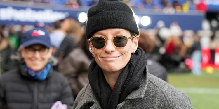 Retired United States soccer player Megan Rapinoe looks on before a SheBelieves Cup match against Colombia at Sports Illustrated Stadium on March 7, 2026, in Harrison, New Jersey. (Brad Smith/ISI Photos/USSF/Getty Images)