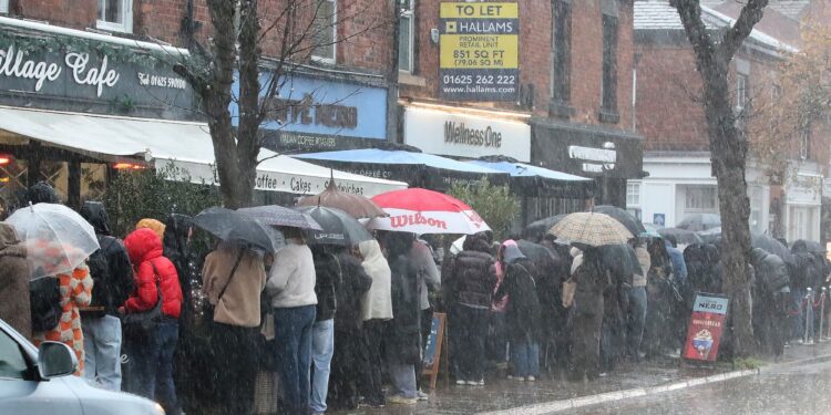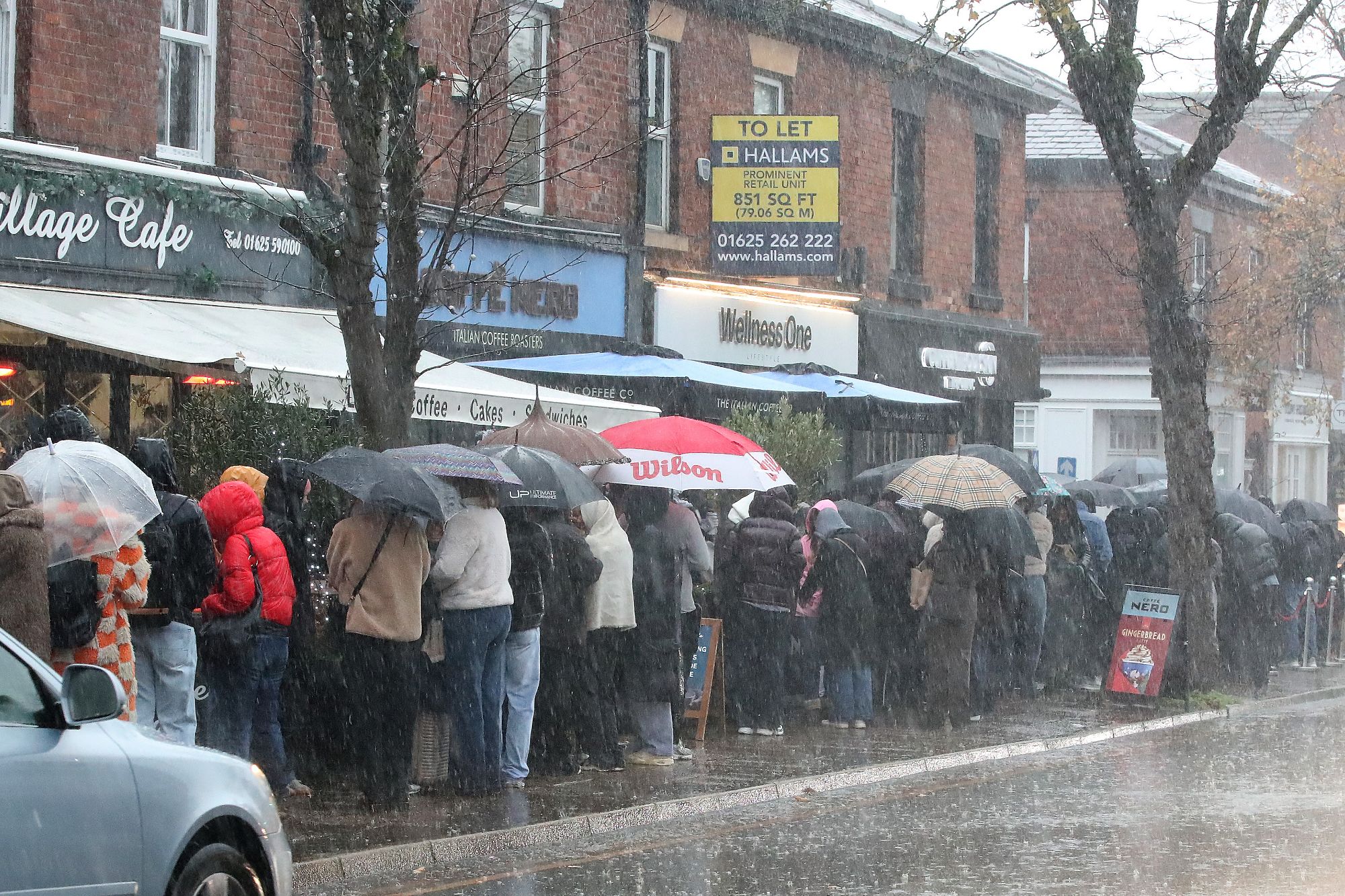 Shoppers were spotted standing in the pouring rain in Alderley Edge, Cheshire, yesterdayCredit: Eamonn & James Clarke