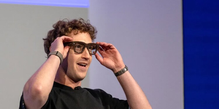 CEO Mark Zuckerberg sported a pair of Meta Ray-Ban Display AI glasses while speaking at an event in Menlo Park, California, on Sept. 17, 2025. (David Paul Morris/Bloomberg via Getty Images)