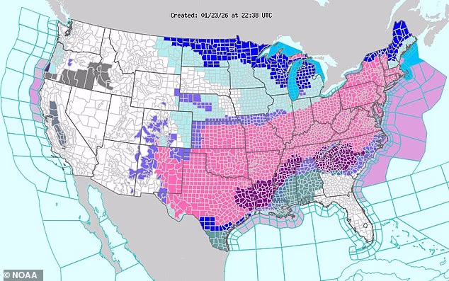 On Friday, January 23, the National Weather Service expanded the scope of their winter storm warnings (seen in pink) to cover more than two dozen states