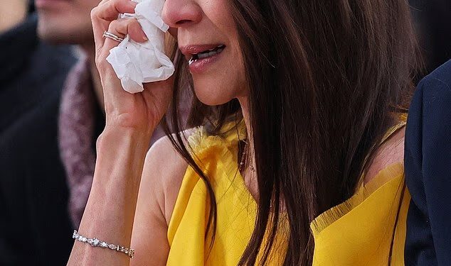 The actress was pictured wiping tears from her eyes during the ceremony