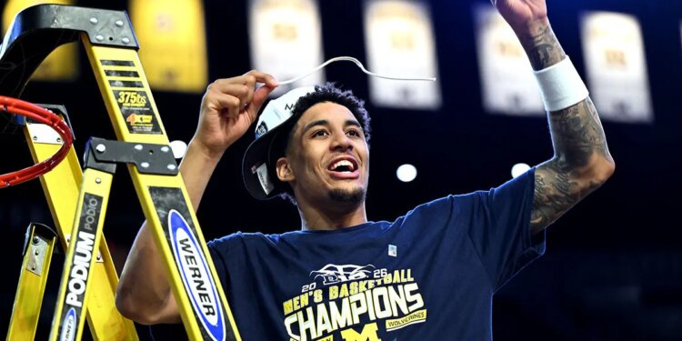 Michigan forward Yaxel Lendeborg celebrates the team’s Big Ten Championship by cutting down a piece of net following their win over Michigan State in Ann Arbor, March 8, 2026. (AP Photo/Lon Horwedel)