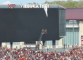 Video: Parachuter rescued after crashing into scoreboard at college stadium