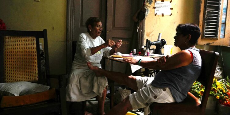 Neya Perez, 86, paints the nails of her neighbor Reyna Maria Rodriguez, 77, during a mass blackout across most of the country, in Havana, Cuba, on March 4, 2026. (REUTERS/Norlys Perez)