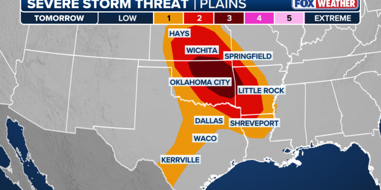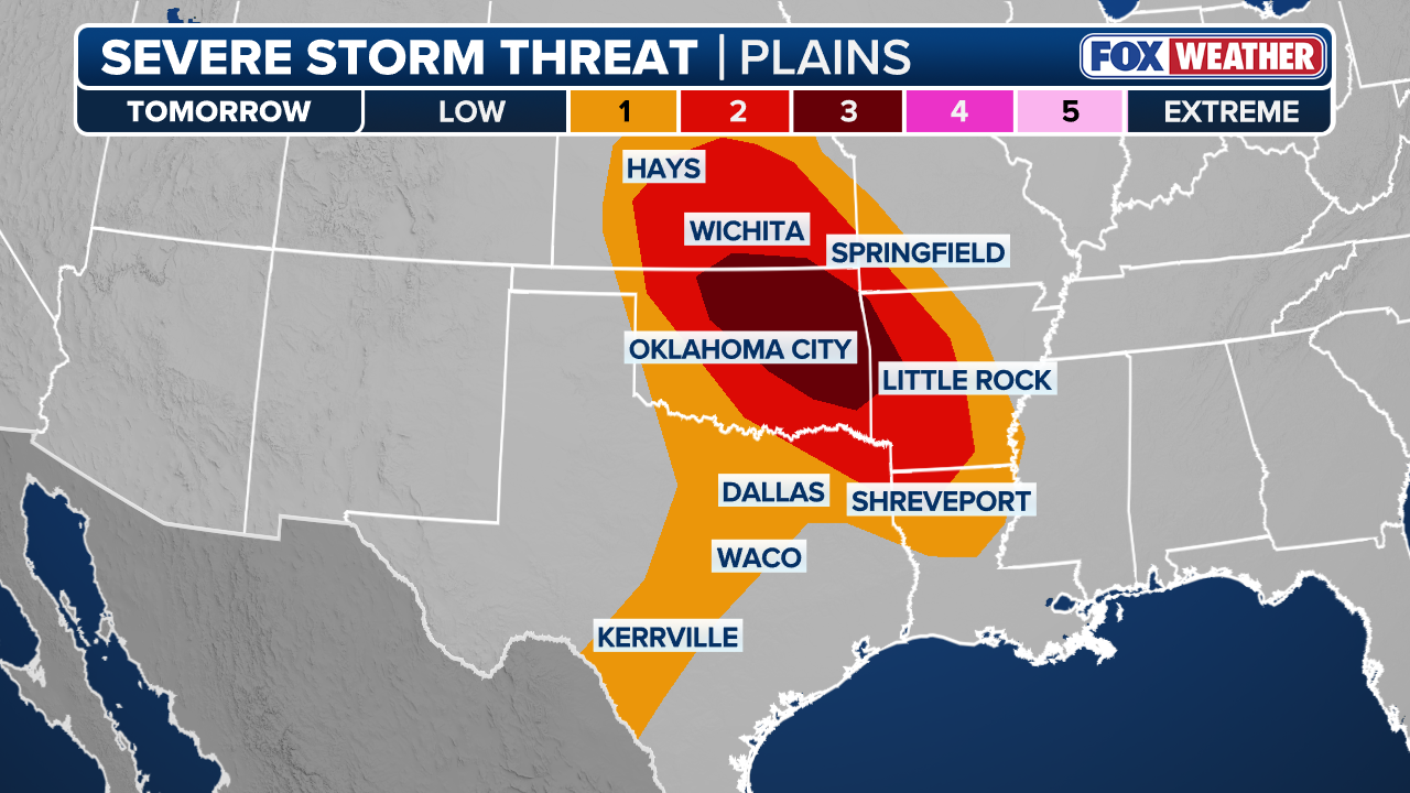 As a result, a level 3/5 severe storm threat is active across central and eastern Oklahoma, along with a level 2/5 threat extending from Kansas to North Louisiana to start the weekend.