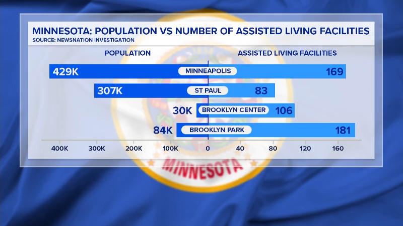 The concentration of facilities in smaller suburbs appears disproportionate to the population. Minneapolis, with a population of nearly 430,000, has 169 assisted living facilities. But Brooklyn Park, with 84,000 residents, has 181 facilities — more than Minneapolis, a city five times its size. Brooklyn Center, with just 30,000 residents, has 106 facilities, compared to 83 in St. Paul, which has a population of 307,000.
