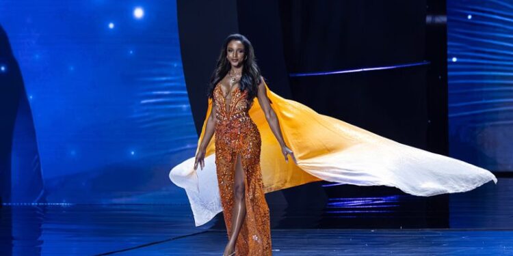 She can be seen standing in front of the audience, modeling an evening gown, before appearing to walk away and fall off the stage.