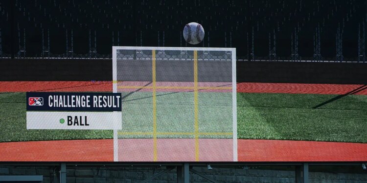 Replay of an automated ball-strike challenge appears on the videoboard during an AAA MiLB game between the Buffalo Bisons and Worcester Red Sox at Polar Park in Worcester, Mass., on May 5, 2023. (Erica Denhoff/Icon Sportswire via Getty Images)