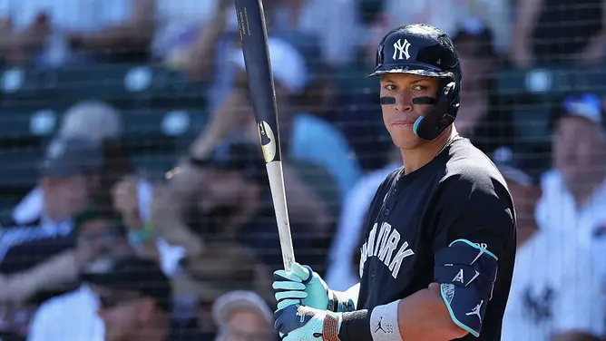 • MESA, ARIZONA – MARCH 23: Aaron Judge #99 of the New York Yankees warms up on deck during the first inning of the spring training game against the Chicago Cubs at Sloan Park on March 23, 2026 in Mesa, Arizona.