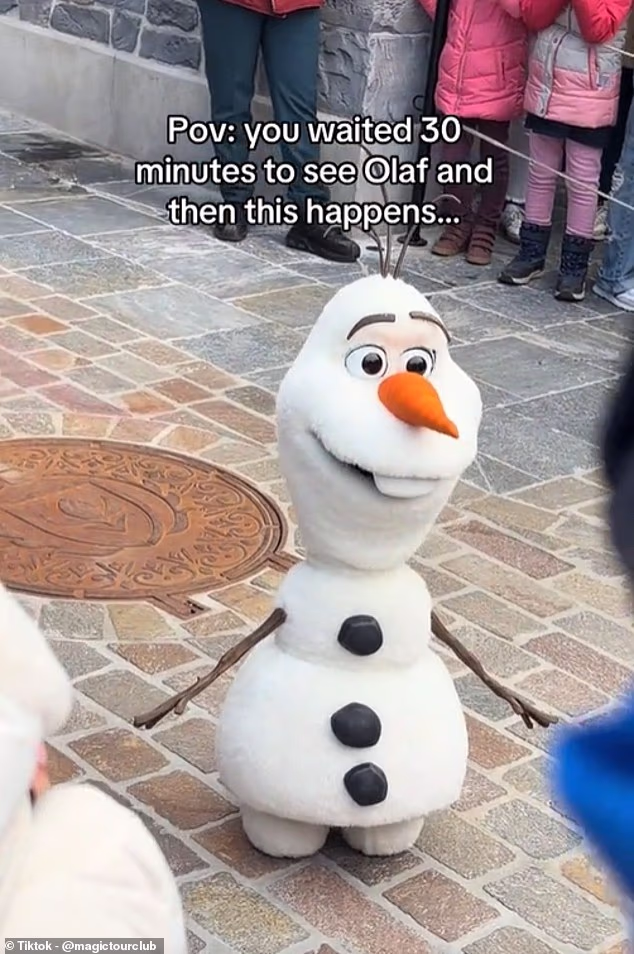 The clip – captioned ‘POV: You waited 30 minutes to see Olaf and then this happens’ – shows a huge crowd of visitors ranging from adults to very young children.