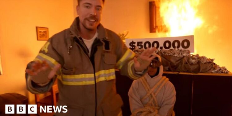 YouTube.com/@MrBeastMrBeast, the world’s biggest YouTuber, has defended his latest stunt video – “Would You Risk Dying for $500,000 (£372,000)” – which shows a professional stuntman escape a blazing building while collecting bags of cash.