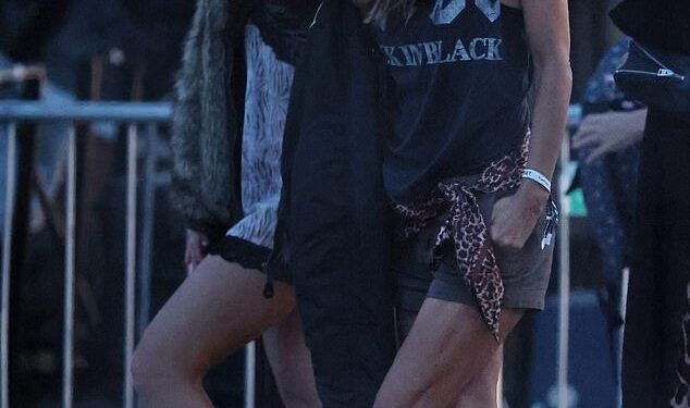 Myleene Klass put on a leggy display in mini shorts as she watched Spinal Tap light up Stonehenge at their secret gig for their upcoming sequel