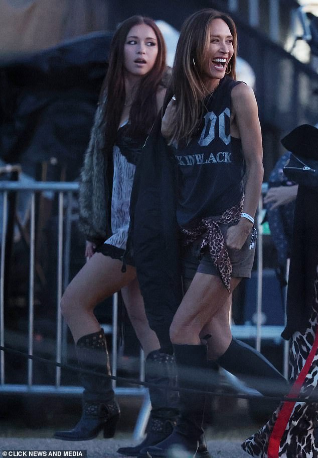 Proving her love for rock music, Myleene completed her ensemble with an ACDC tank top and a leopard print scarf around her waist.