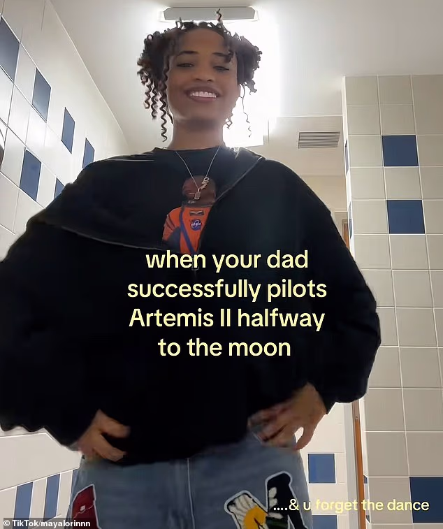 She wrote: ‘When your dad successfully pilots Artemis II halfway to the moon… & you forget the dance.’