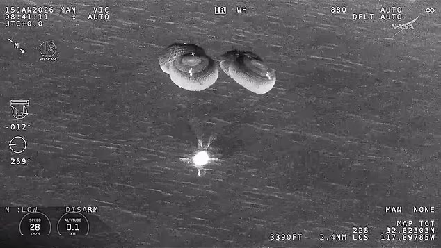 The spacecraft fired its engines to deorbit at 2:50am before enduring a fiery re-entry through Earth’s atmosphere, deploying four parachutes to slow its descent into the ocean moments before splashdown.