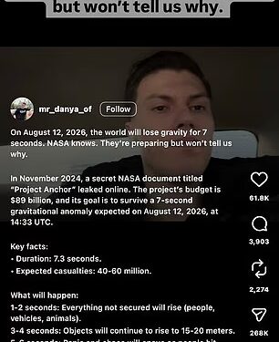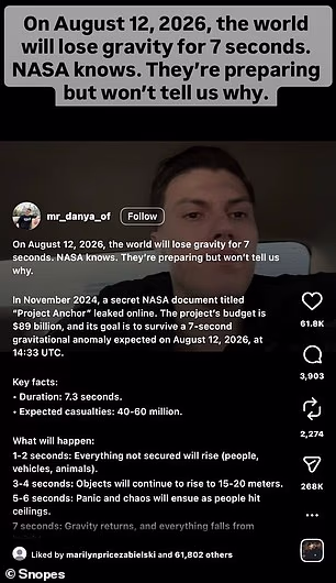 In a lengthy post, the user wrote: ‘On August 12, 2026, the world will lose gravity for seven seconds. NASA knows. They’re preparing but won’t tell us why.’
