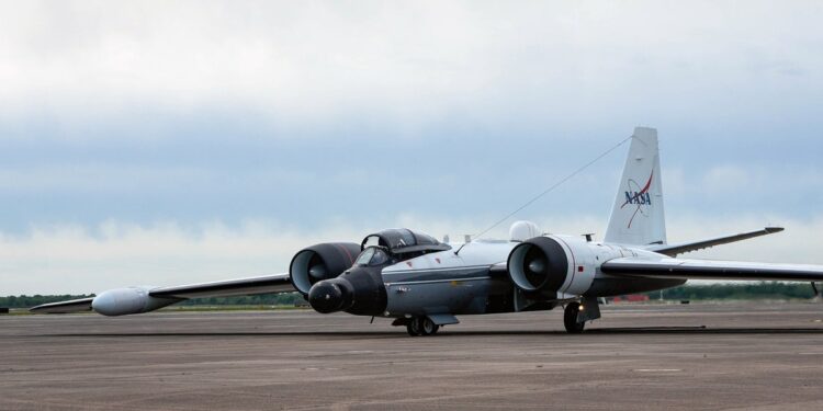 NASA’s high-altitude WB-57 aircraft took off from Ellington Field Joint Reserve Base in Houston on Tuesday, and will conduct aerial surveys using its DyNAMITE (Day/Night Airborne Motion Imager for Terrestrial Environments) sensor.