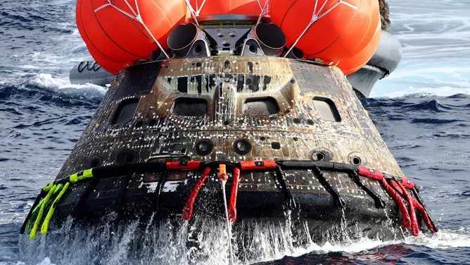 NASA’s Orion Capsule is drawn to the well deck of the USS Portland following a successful uncrewed Artemis I Moon Mission after it splashed down in the Pacific Ocean off the coast of Baja California, Mexico, on December 11, 2022. Orion was launched November 16 on the Artemis rocket for a 25-day mission to the Moon. The main goal of this mission was to test Orion’s heat shield — for the day when it is humans and not test mannequins riding inside.