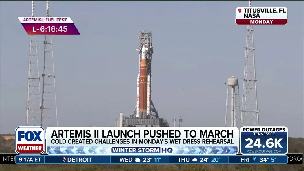 NASA has pushed back the February launch of Artemis 2 to March after ending a critical fuel test early Tuesday morning, which was complicated by a liquid hydrogen leak and cold temperatures due to the rare Arctic outbreak that has gripped Florida. Artemis 2 would be the first crewed mission to return to the Moon since Apollo 17 in 1972. The pre-launch test was designed to fuel the Space Launch System and identify technical issues before launch.