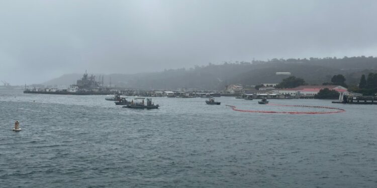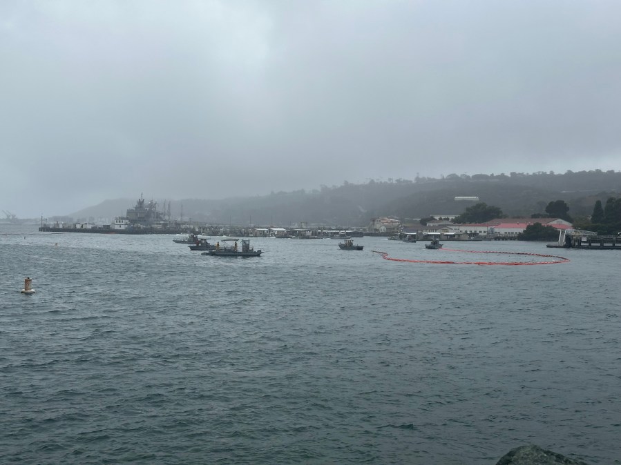 Oil was observed seeping into the water of the San Diego Bay as crews attempted to recover the remains of the plane.