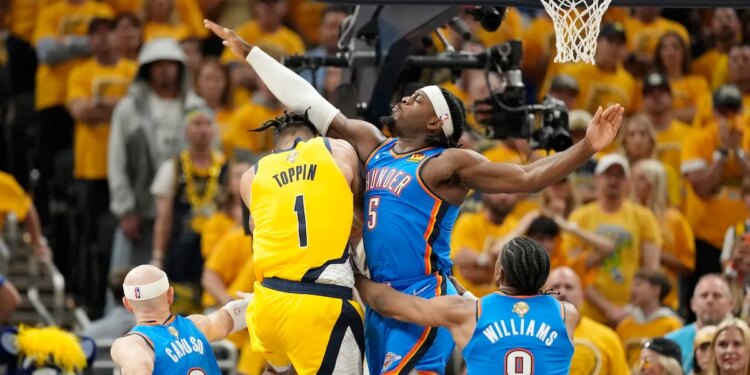 Indiana Pacers forward Obi Toppin (1) drives to the basket against Oklahoma City Thunder guard Luguentz Dort (5) during the first half of Game 4 of the 2025 NBA Finals at Gainbridge Fieldhouse in Indianapolis, Indiana, on June 13, 2025. (Kyle Terada-Imagn Images)