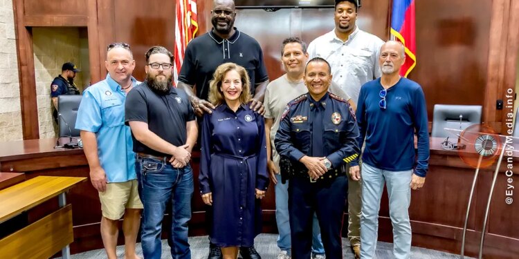 Shaquille O’Neal and Jordan Wilmore pose with members of Kemah police department in Kemah, Texas, on Dec. 28, 2025. (EyeCandyMedia)