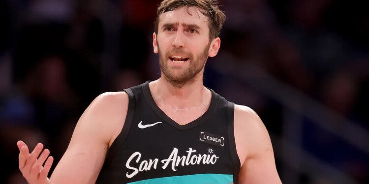 Luke Kornet of the San Antonio Spurs reaches for the ball during the third quarter against the Brooklyn Nets at Barclays Center on February 26, 2026 in the Brooklyn borough of New York City. (Ishika Samant/Getty Images)