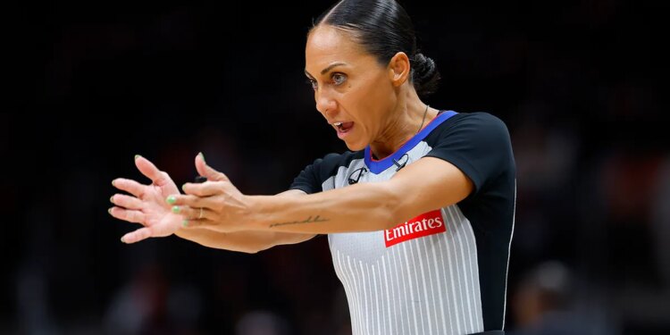 Referee Sha’Rae Mitchell (98) signals during the fourth quarter of an NBA basketball game between the Brooklyn Nets and the Atlanta Hawks at State Farm Arena in Atlanta, Georgia, on March 12, 2026. (Todd Kirkland/Getty Images)