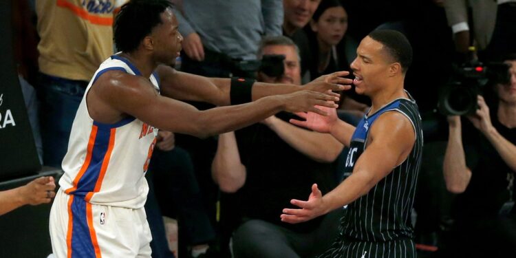 New York Knicks forward OG Anunoby, left, and Orlando Magic guard Desmond Bane, right, get into an altercation during the second half of an NBA basketball game Sunday, Dec. 7, 2025, in New York. (AP Photo/John Munson)