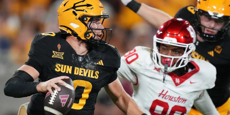 ASU Sun Devils quarterback Sam Leavitt (10) scrambles away from Houston Cougars defensive lineman Eddie Walls III (90) at Mountain America Stadium in Tempe on Oct. 25, 2025. (Joe Rondone/The Republic / USA TODAY NETWORK via Imagn Images)
