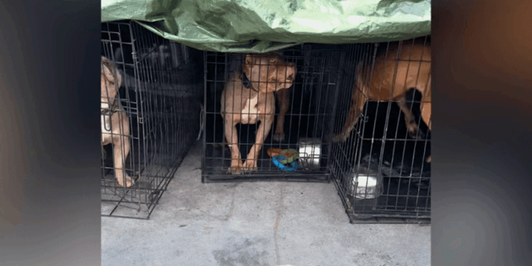 • Pit bulls are seen in cages in L.A.’s Skid Row neighborhood. Spring 2025. (KTLA)