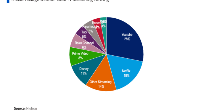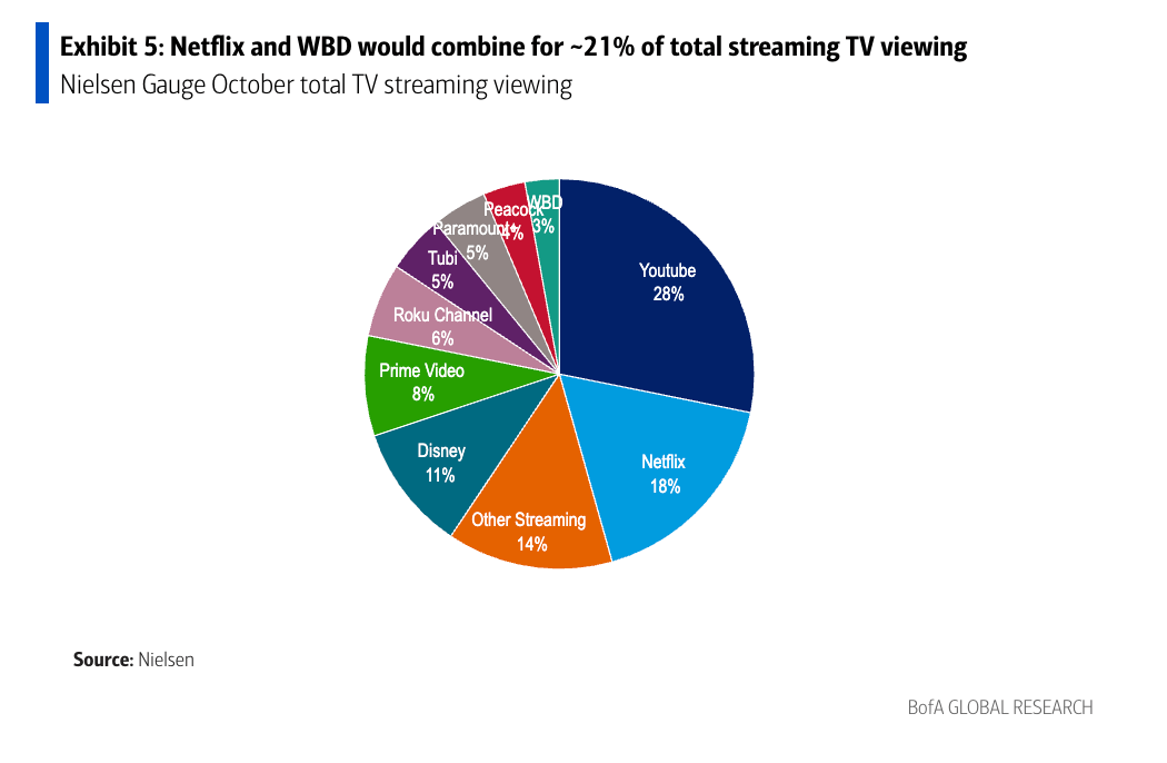 BofA Research’s Media & Entertainment team used a different metric—total TV streaming—from Nielsen data to calculate that Warner and Netflix combined would be about 21% of the market, whereas Paramount and Netflix would be 8%. Both would still come in behind YouTube at 28%, however.