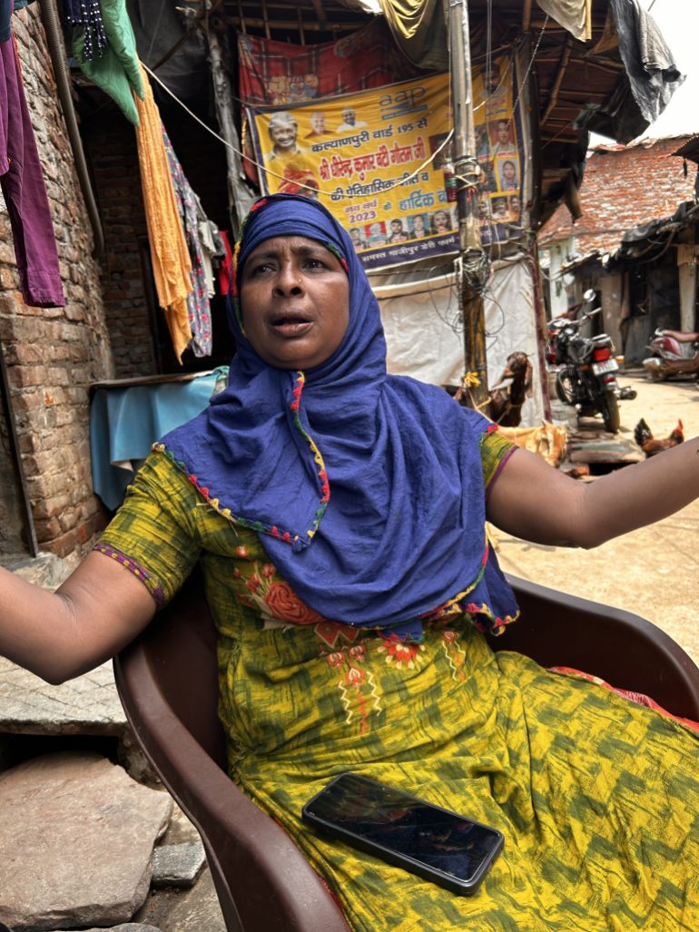 Dressed in a ragged, green and yellow kurta, and sitting on a chair in a narrow lane in the middle of the slum settlement where she lives beside the dump site, Begum explains that she came into contact with medical waste in 2022, which infected her eye.
