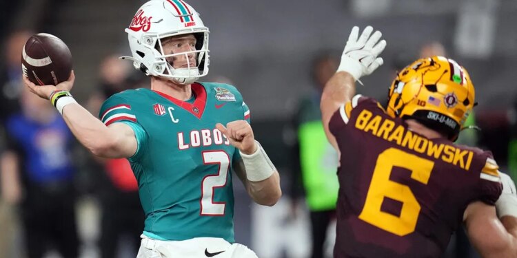 New Mexico quarterback Jack Layne (2) throws the ball around Minnesota linebacker Maverick Baranowski in the first half of the Rate Bowl Friday, Dec. 26, 2025, in Phoenix. (AP Photo/Rick Scuteri)