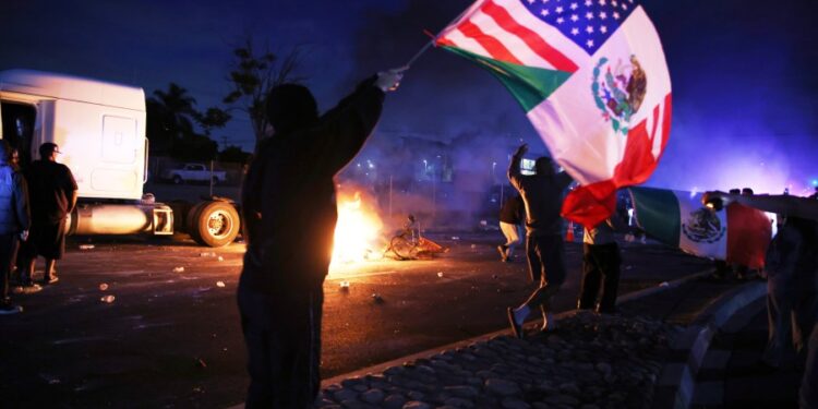 A demonstrator waves an American and Mexican flag during a protest in Compton, Calif., Saturday, June 7, 2025, after federal immigration authorities conducted operations. (AP Photo/Ethan Swope)
