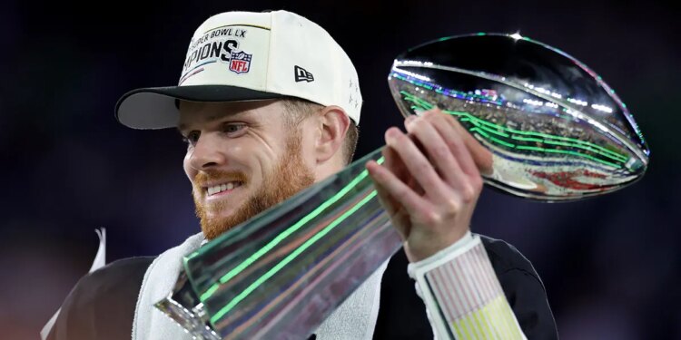 Sam Darnold of the Seattle Seahawks celebrates after the NFL Super Bowl against the New England Patriots at Levi’s Stadium Feb. 8, 2026, in Santa Clara, Calif. The Seahawks defeated the Patriots, 29-13. (Kevin Sabitus/Getty Images)