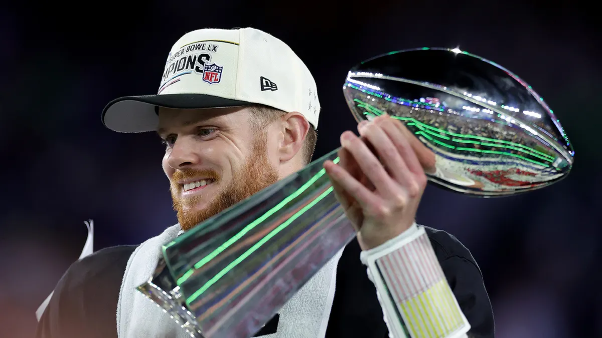 Sam Darnold of the Seattle Seahawks celebrates with the Vince Lombardi Trophy after winning the Super Bowl against the New England Patriots at Levi’s Stadium Feb. 8, 2026, in Santa Clara, Calif. (Ronald Martinez/Getty Images)