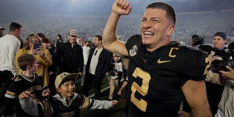 Vanderbilt quarterback Diego Pavia (2) celebrates after the team’s win over Kentucky at FirstBank Stadium in Nashville, Tennessee, Saturday, Nov. 22, 2025. (Mark Zaleski/The Tennessean)