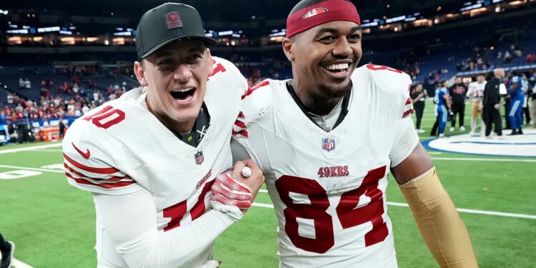 San Francisco 49ers quarterback Mac Jones, left, and wide receiver Kendrick Bourne (84) celebrate after an NFL football game against the Indianapolis Colts, Monday, Dec. 22, 2025, in Indianapolis. (AP Photo/AJ Mast)