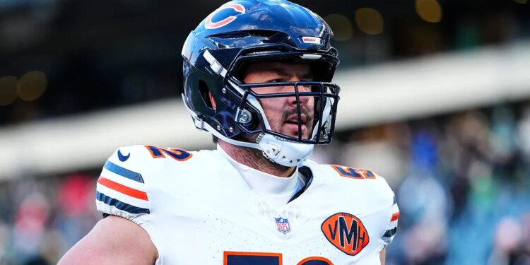 Drew Dalman (52) of the Chicago Bears exits the field after warmups prior to an NFL game against the Philadelphia Eagles at Lincoln Financial Field in Philadelphia, Pennsylvania, on Nov. 28, 2025. (Cooper Neill/Getty Images)