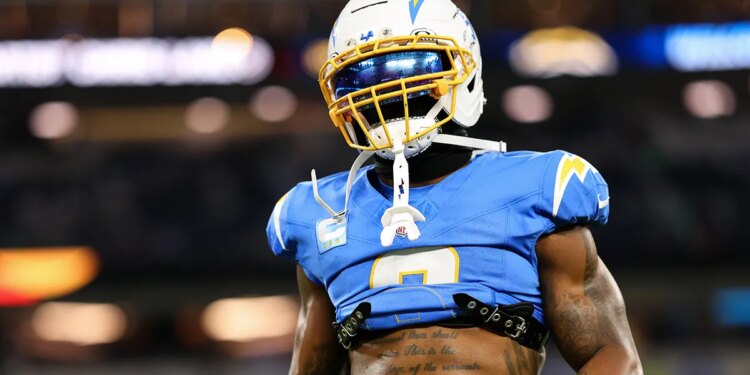 Denzel Perryman of the Los Angeles Chargers warms up prior to the game against the Philadelphia Eagles at SoFi Stadium on Dec. 8, 2025 in Inglewood, California. (Brooke Sutton/Getty Images)