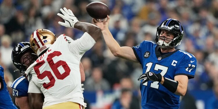 Indianapolis Colts quarterback Philip Rivers (17) passes as San Francisco 49ers defensive lineman Keion White (56) applies pressure during the first half of an NFL football game, Monday, Dec. 22, 2025, in Indianapolis. (Carolyn Kaster/AP Photo)